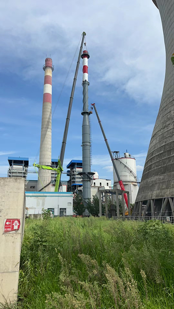 六安光大環(huán)保新建鋼煙囪吊裝中